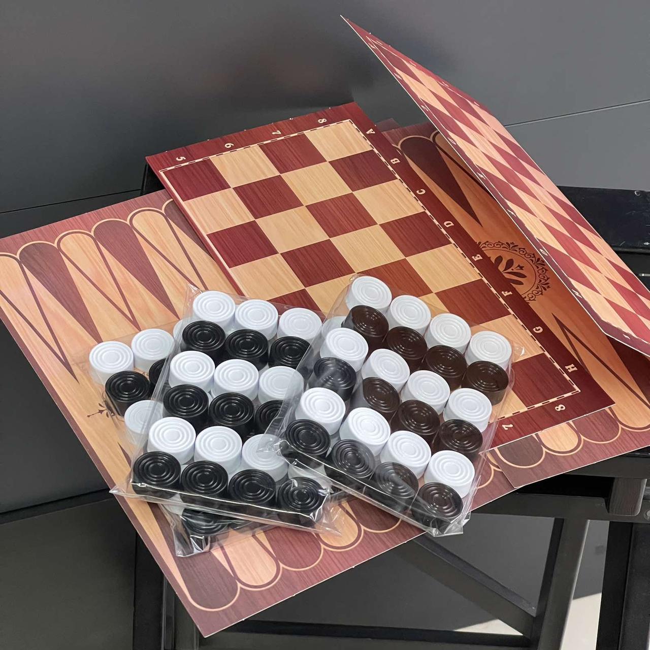 Шашки + нарди, 3 набори. Один набір включає: 24 шашки та 1 картонне ігрове поле (для гри в шашки та нарди). Розмір набору 32*16*2см.